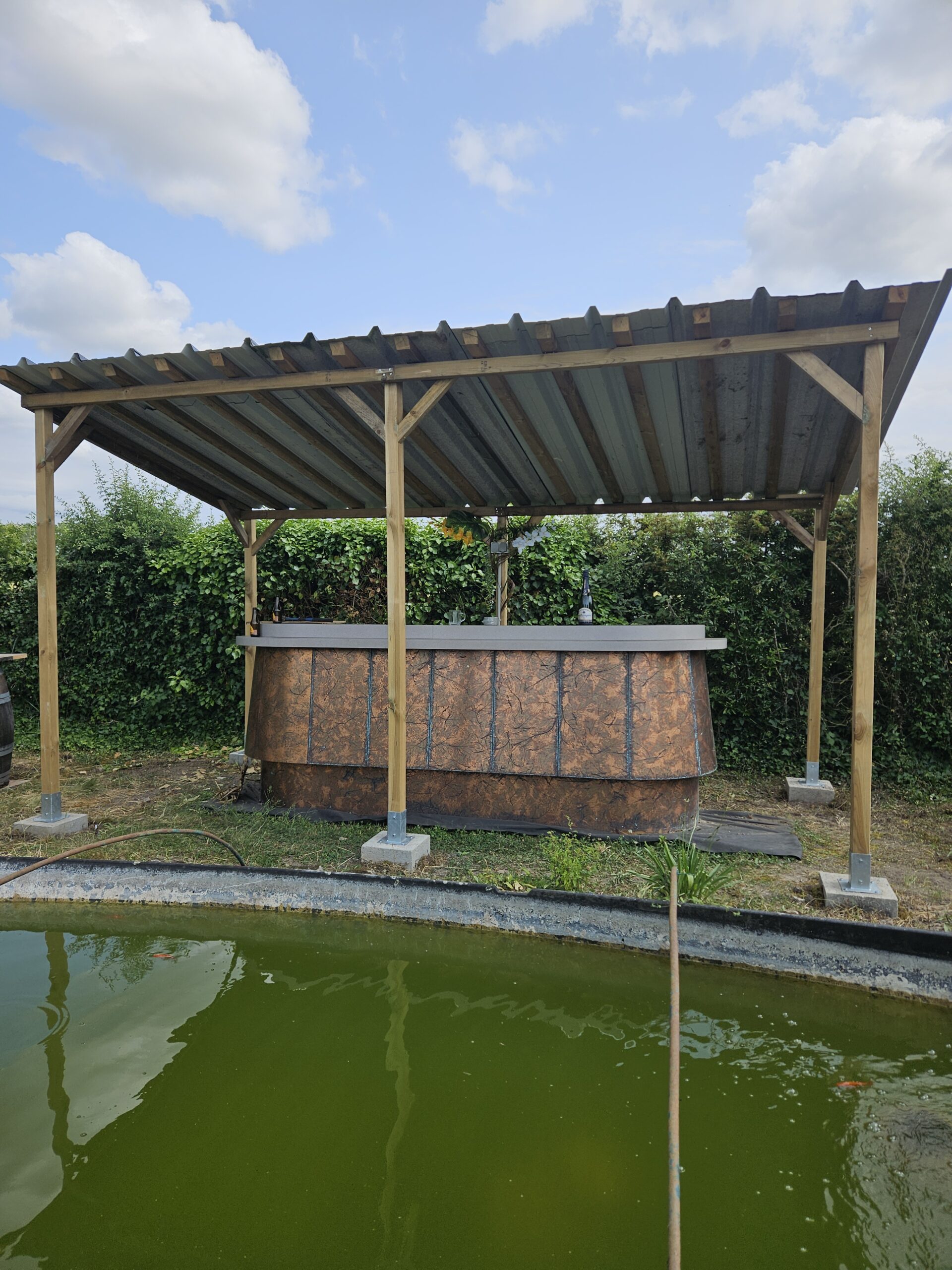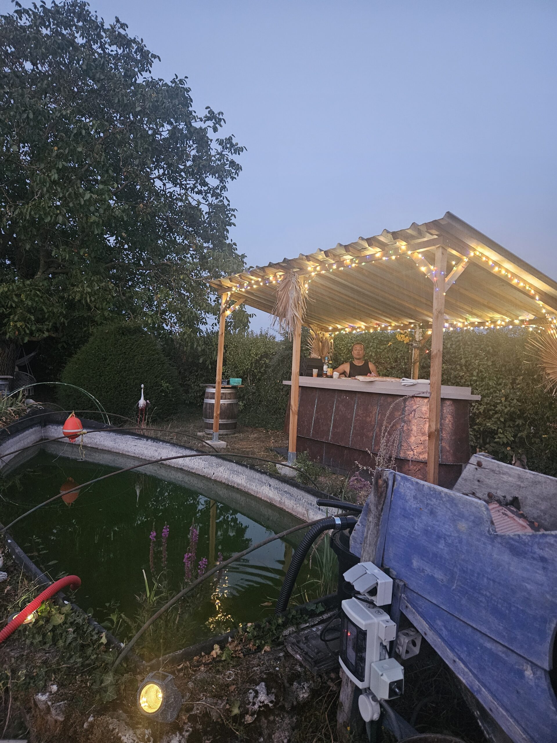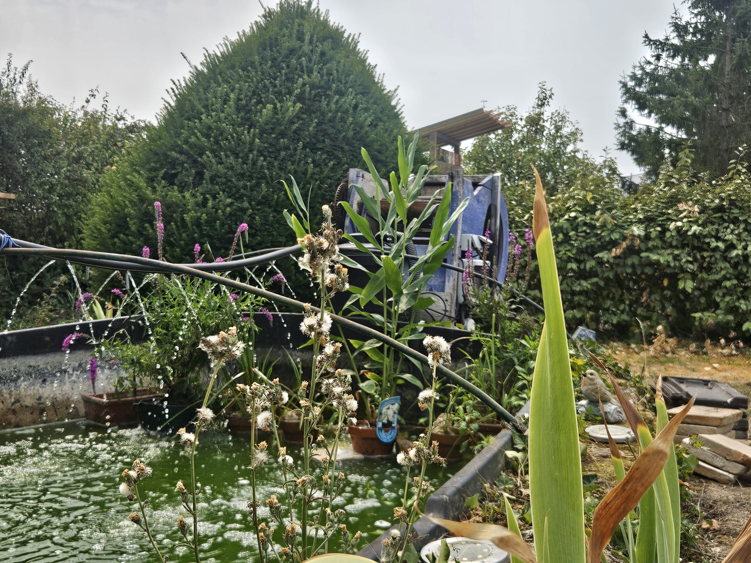 Elle est puisée via une pompe immergée doté d’un premier filtre à grosses particules. elle passe ensuite dans deux cuves IBC de 1000 litres dans lesquelles l’eau ne reste pas statique contrairement aux réseaux de ville. Elle est continuellement brassée et oxygènée durant la journée.